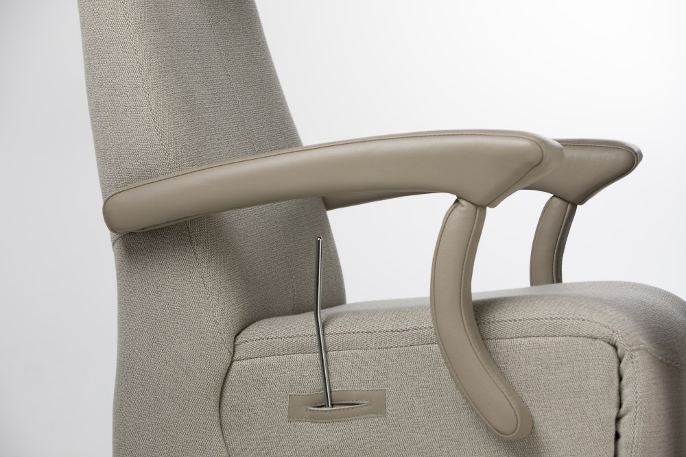 Allereerst is er een in hoogte verstelbaar hoofdkussen. Dit geeft in combinatie met de standaard aanwezige topswing een perfecte ondersteuning van uw hoofd. Daarnaast is er de unieke vormgeving van de Universal armlegger. Deze is niet alleen fraai, maar ook zeer praktisch. De voorzijde van deze met de rug meebewegende armlegger geeft namelijk een ideale grip en dus ondersteuning bij het opstaan.
